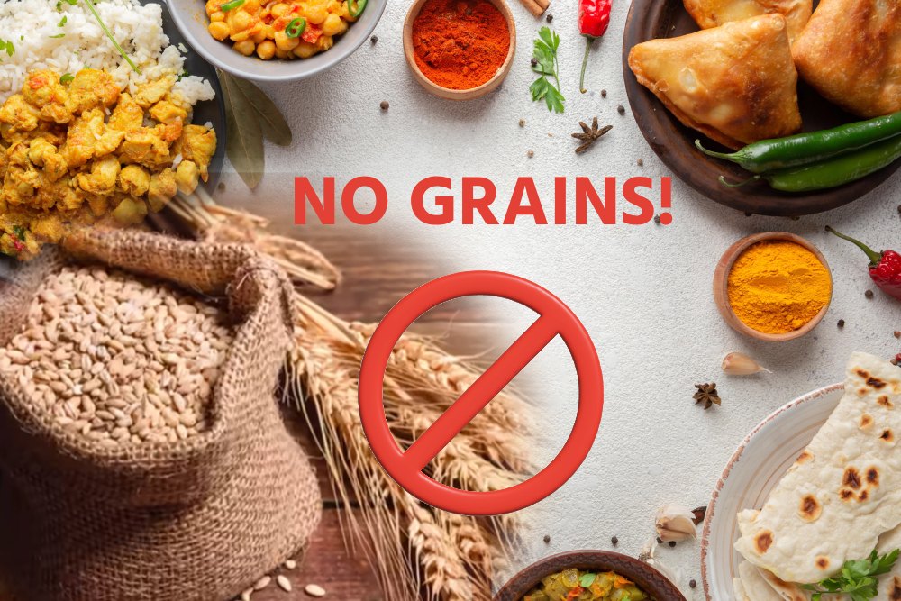 ❌ गेहूं, चावल, ओट्स, मक्का, जौ, और बाजरा / Grains like Wheat, rice, oats, corn, barley, millet